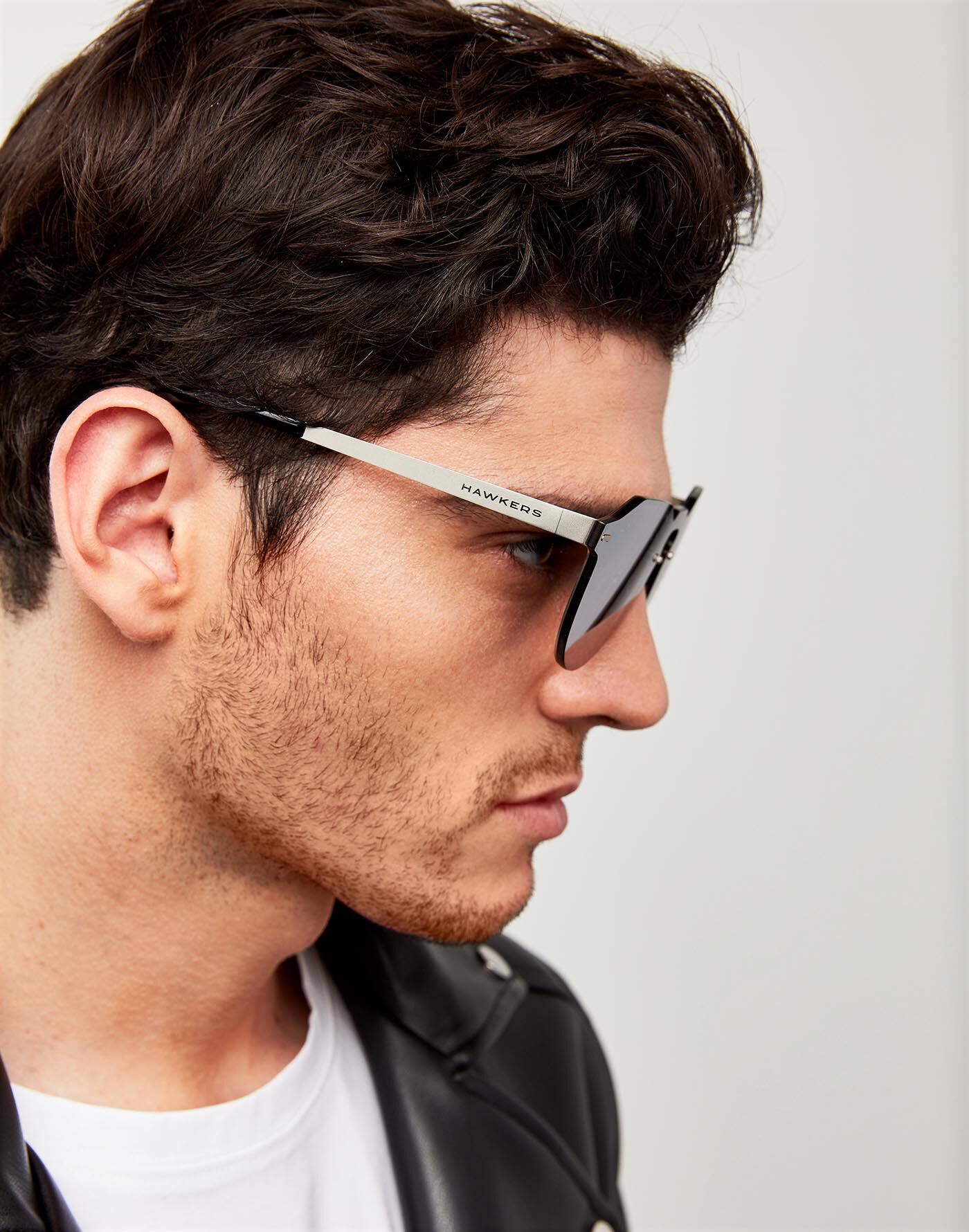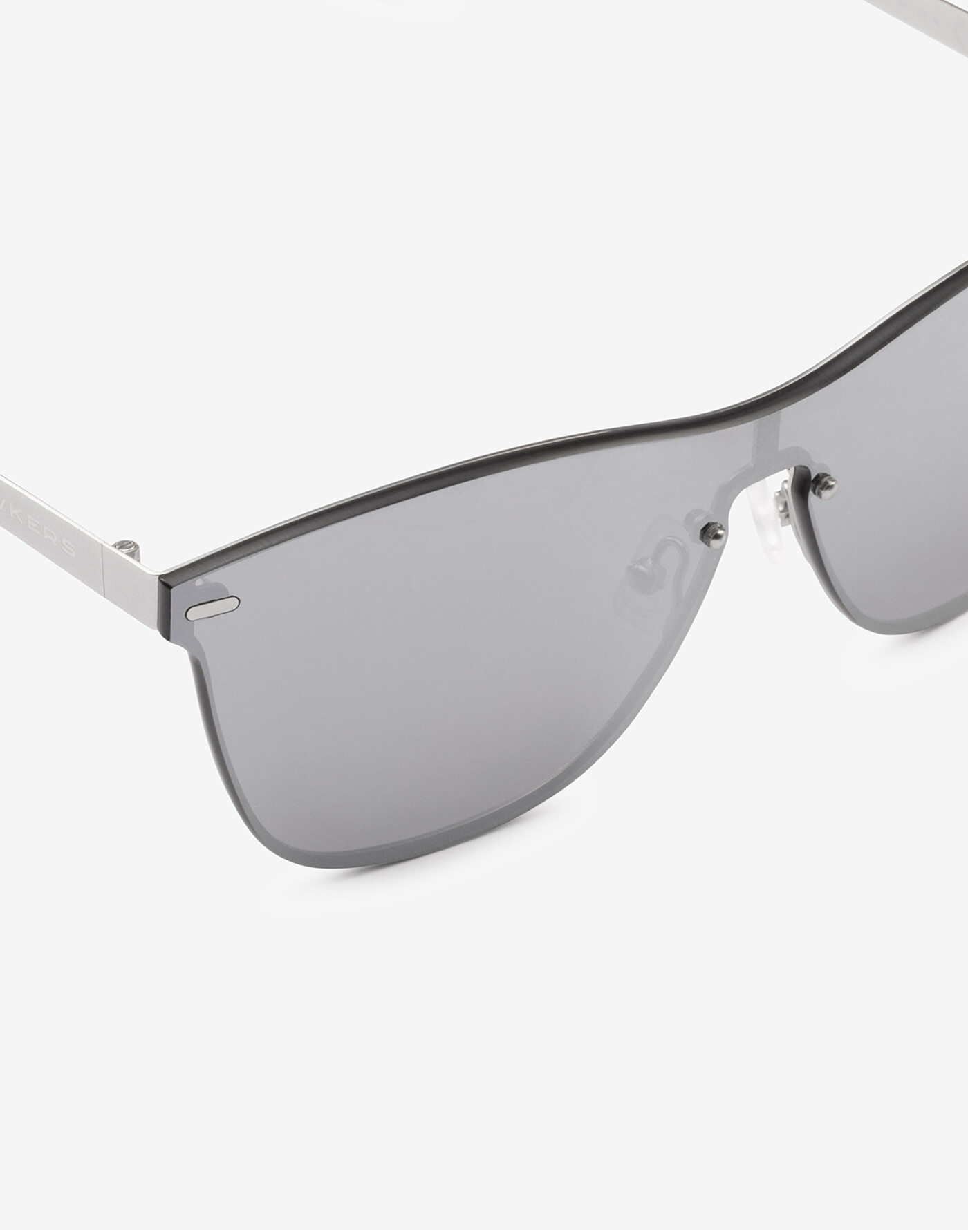 ONE-style full front sunglasses with matte silver metal frame and silver shield lenses.