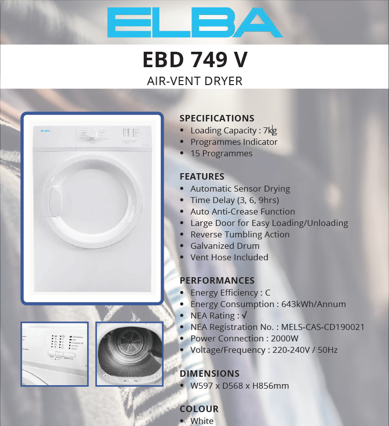 ELBA EBD749V 7KG FRONT LOAD VENTED DRYER