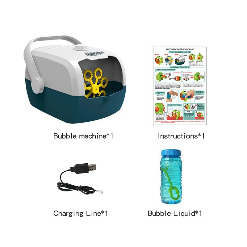 1* bubble machine, 1* charging cable, 1* manual