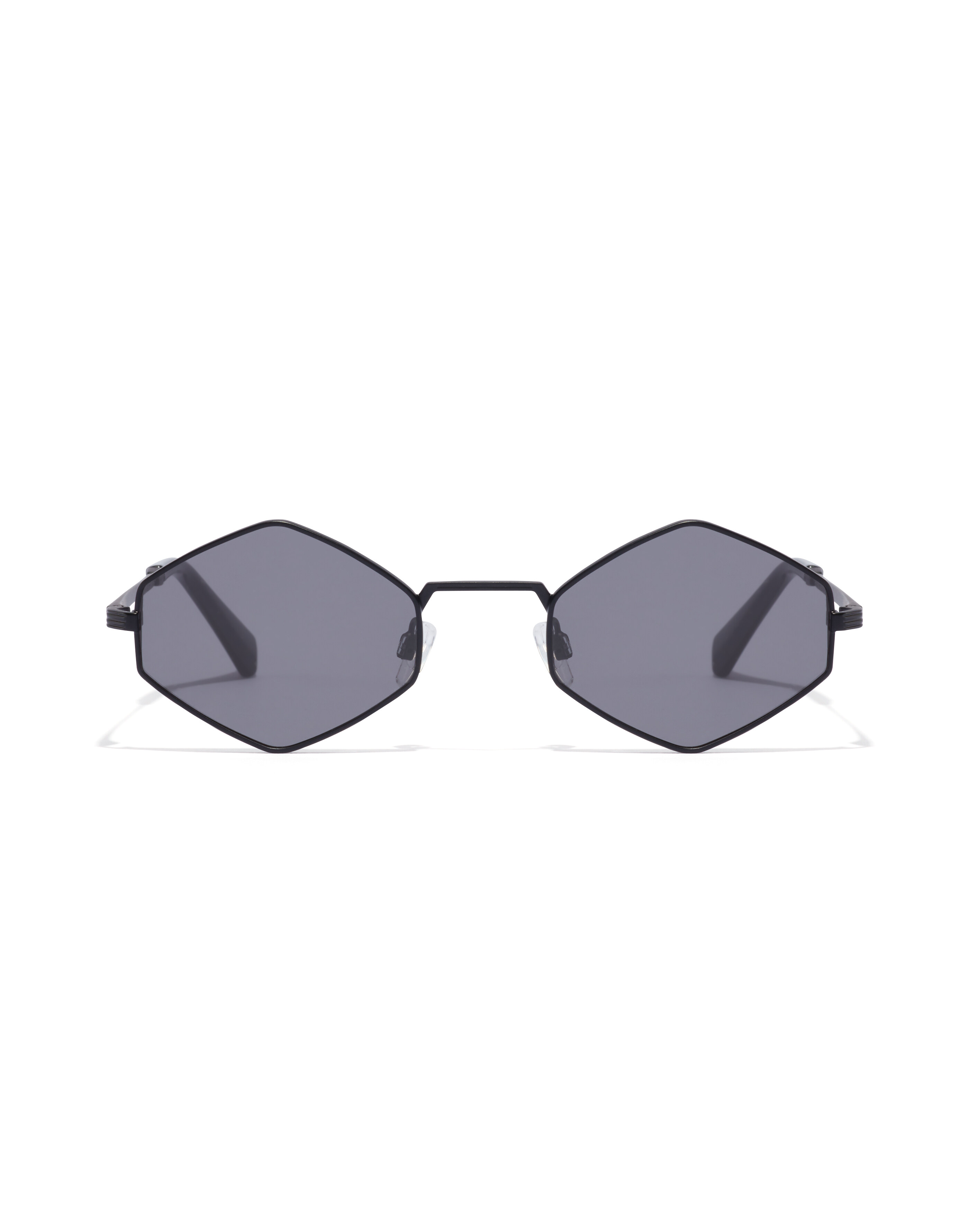 These slim hexagonal metallic sunglasses take their design cue from the smiley-face rave scene of the early 90s. This all-black model combines matt black stainless steel frame structure with black lenses and TR90 earpieces.