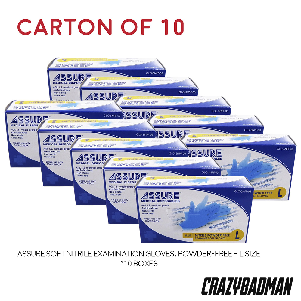 [Carton of 10] ASSURE Soft Nitrile Disposable Examination Gloves, Powder-Free (100pcs/box, Size, XS/S/M/L))
