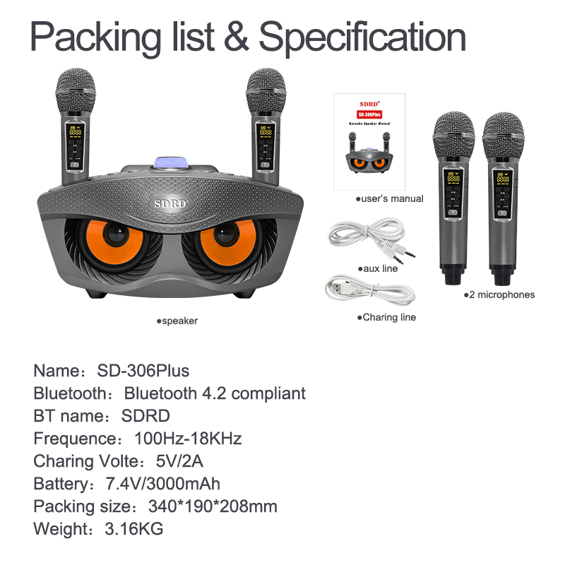 -Two wireless microphones Support even hello tone one button elimination Play micro SD card,