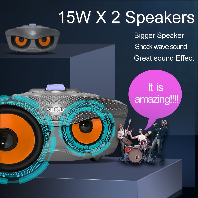 Feature:-Play music -Battery: Yes-Smart Personal Assistant: None-Channels:2 (2.0)-Cabinet Material: Plastic-Communication: AUX, Bluetooth/ USB Drive-Power source: battery, -AC Output power:20W -Support memory card: Yes-Support APP: No.-Built-in microphone: Yes-Frequency range:100Hz-18KHz-PMPO:20W-Audio Crossover: two way