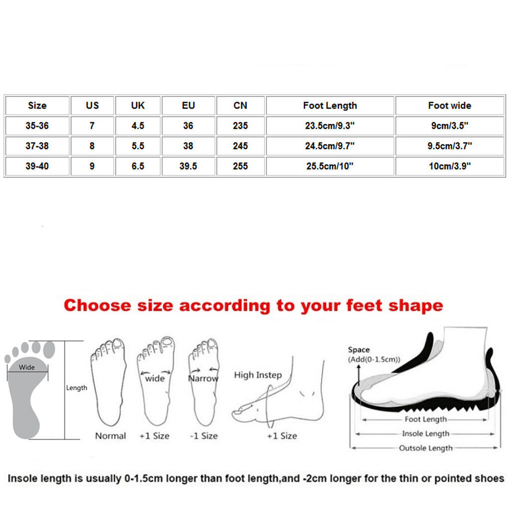 | Size:35-36 | US:7 | UK:4.5 | EU:36 | CN:235 | Foot Length :23.5cm/9.3" | Foot wide :9cm/3.5" |