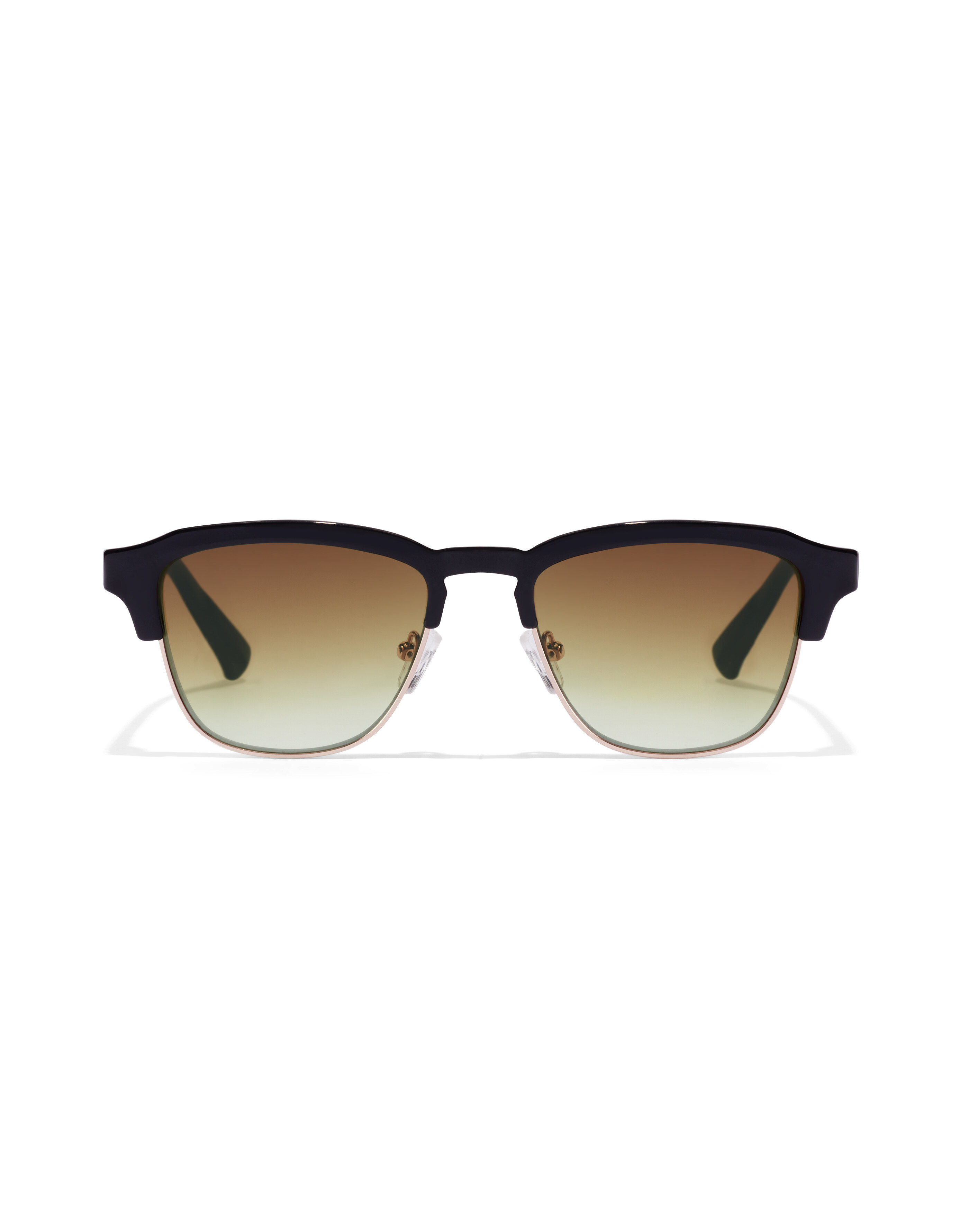 The upper front and polished black sideburns are combined with gold metal bottom rings and degraded brown lenses.