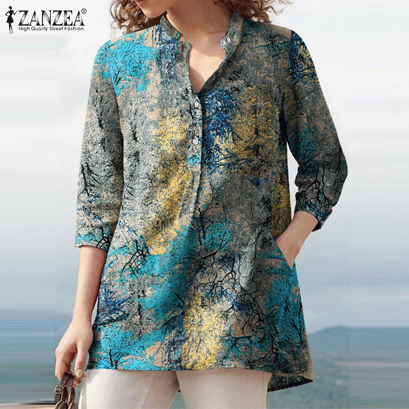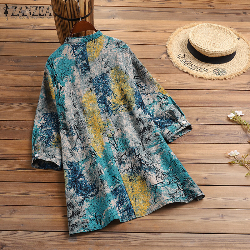 Rulfepy ZANZEA Womens 3/4 Sleeve V Neck Button Up Tops Vintage Floral Printed Shirts Blouse