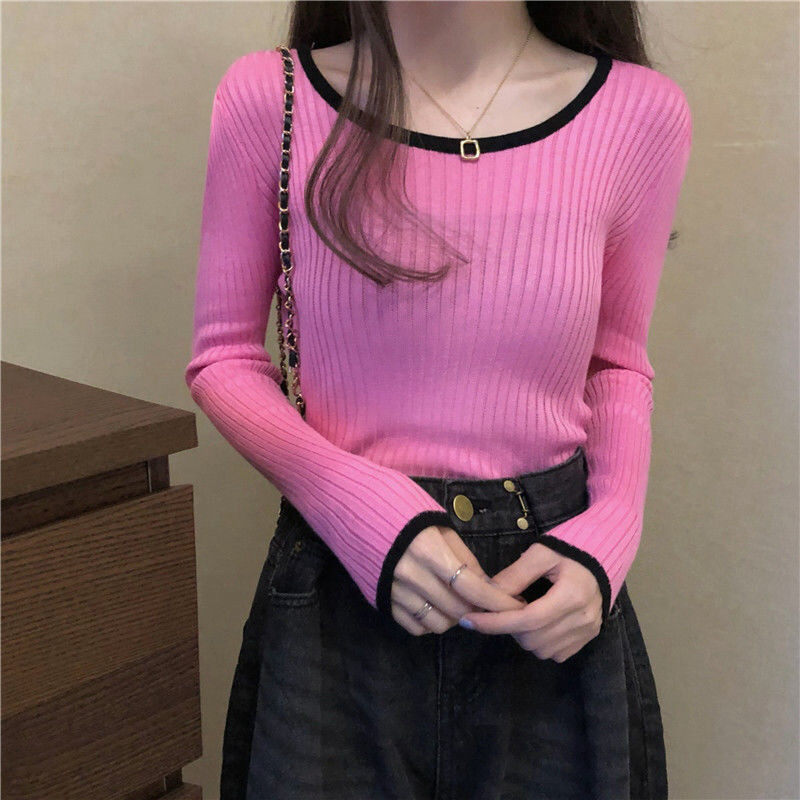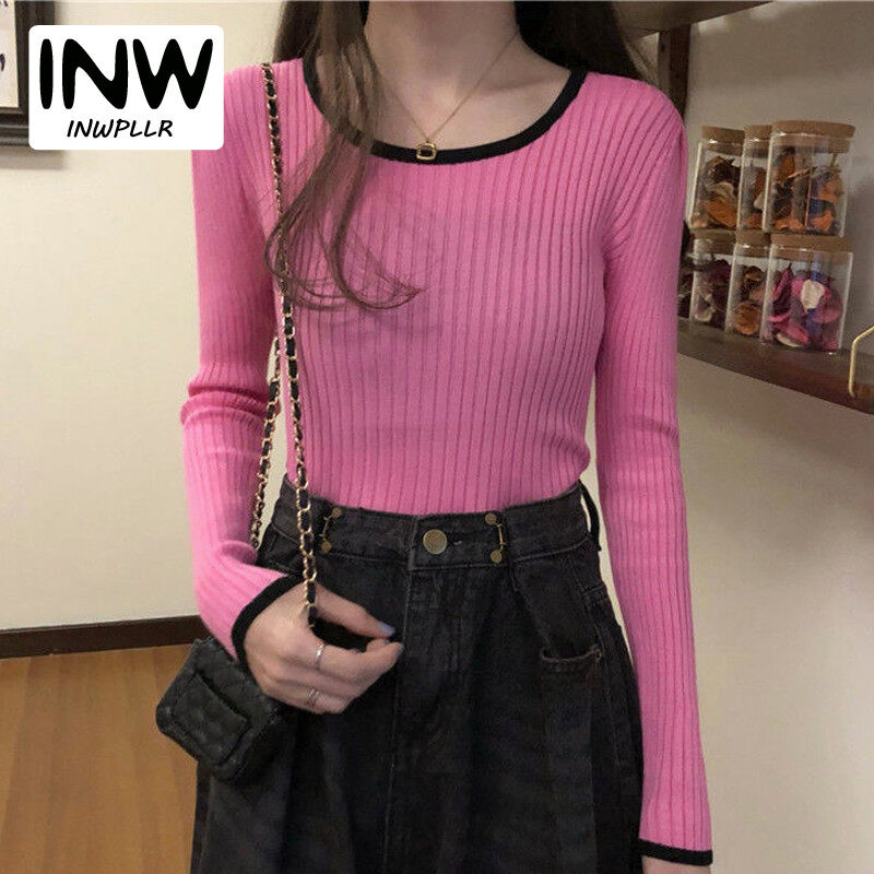 • INWPLLR Korean Style Women's Tshirts Solid Knitted Tops Tees Multi Colors Female Tops Casual O-Neck Long Sleeve T-shirts