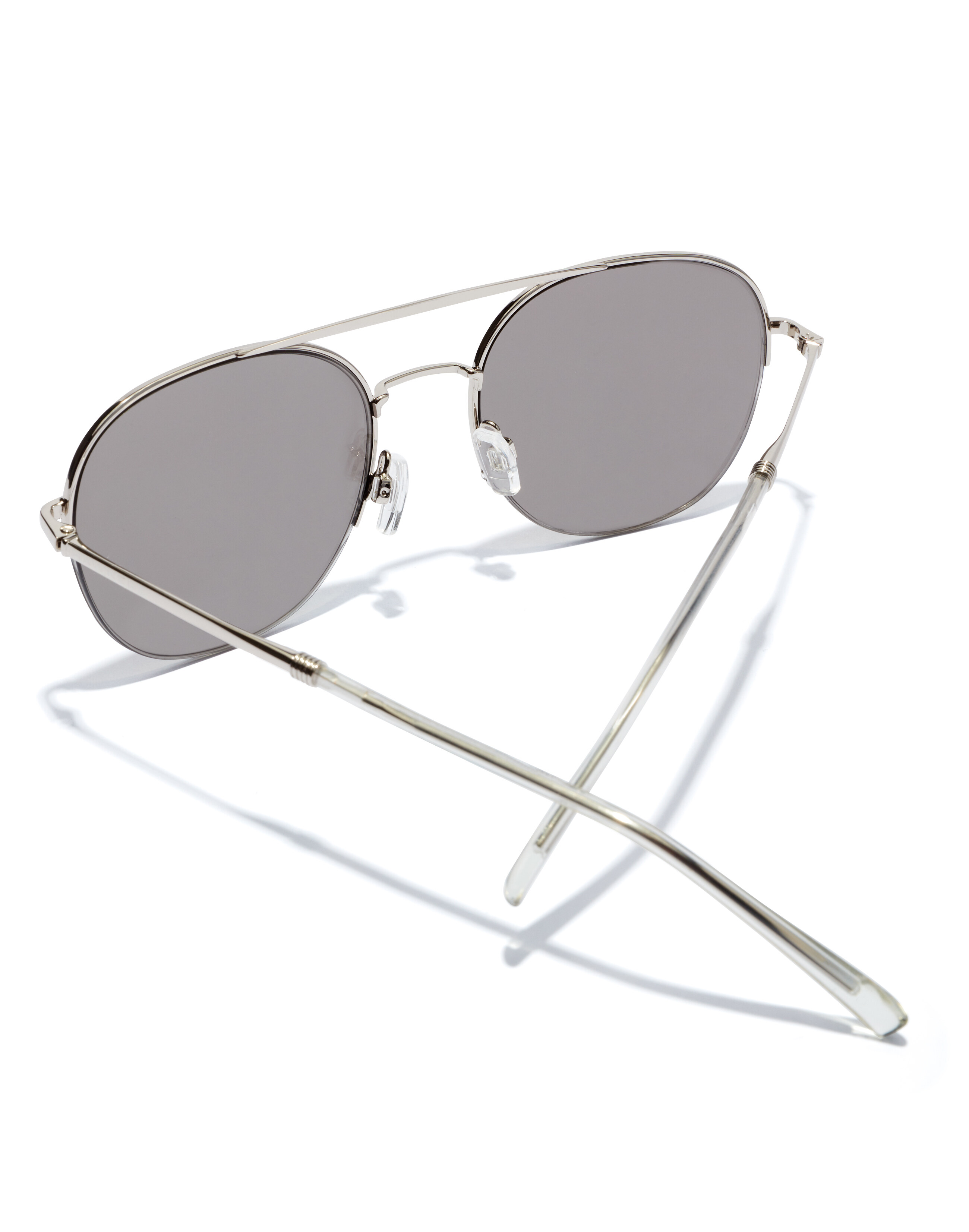 A rounded aviator-style metal frame in polished silver with classic double-bridge, slender temples with long, transparent ear pieces, offset half-rims and mirrored beige lenses.