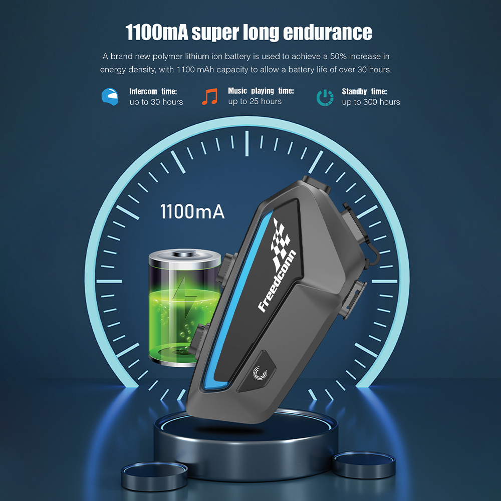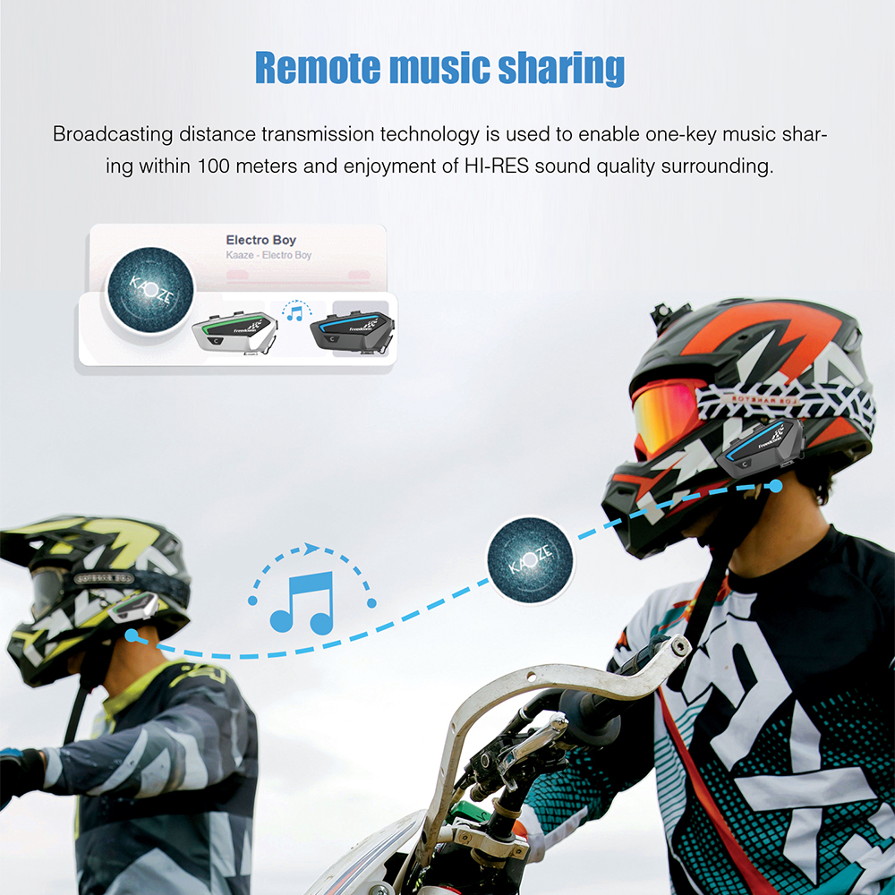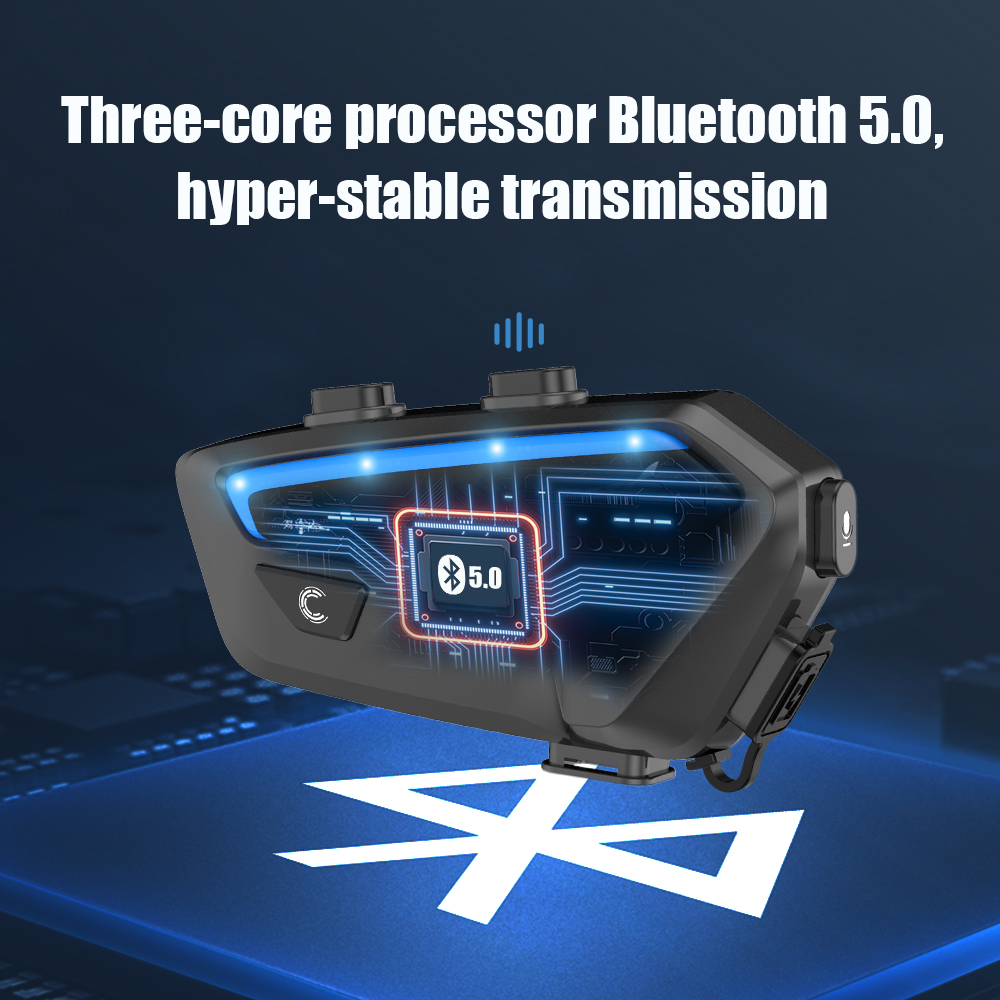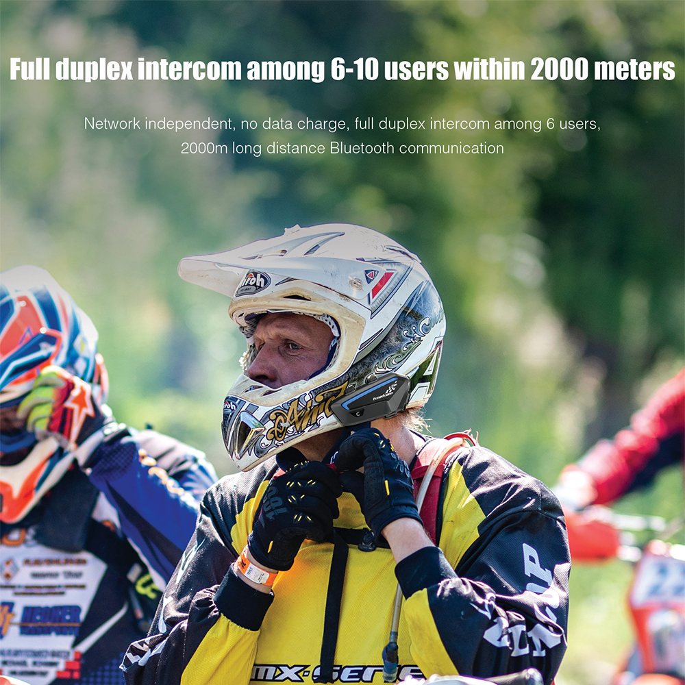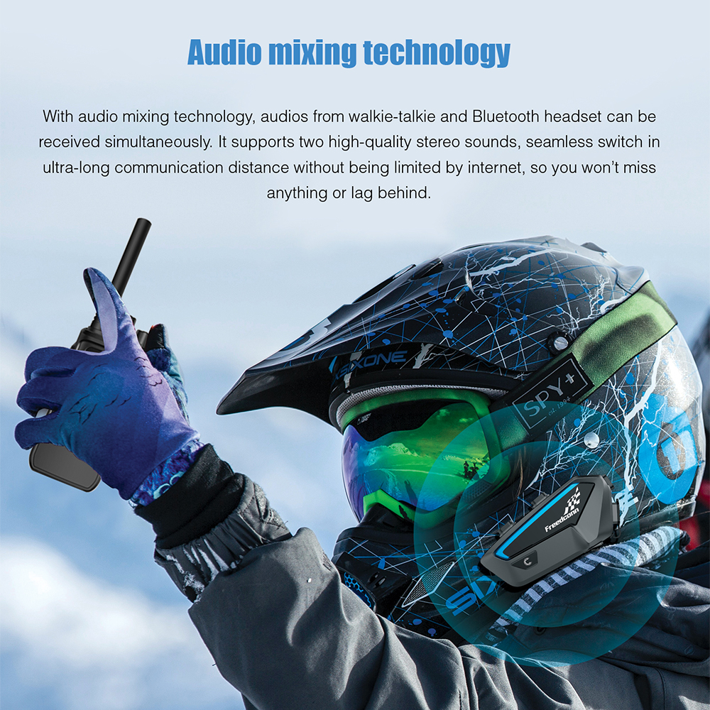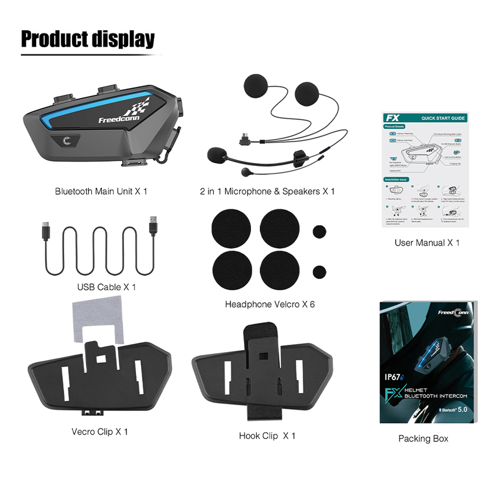 Feature: 1. 5.0 dual-mode 3-core low-power chip, support 3rd party connection2. Multi-group intercom, best for 6 persons, the intercom distance is 2 kilometers.3. 2-person music sharing4. Colorful lights5. CVC intelligent noise reduction6. Equipped with high-fidelity dynamic stereo headphones7. IP67 waterproof8. 1100mAh high capacity batterySpecification:Frequency: 2.4 GHzWeight: 55.2gDimensions: 88 x 53 x 31 mm/3.3.46x2.09x1.22"Battery capacity: 1100mAhStandby time: After 15 minutes of standby, it will enter the super power saving state, and the machine will automatically shut downContinuous working time: 22 hours (phone calls), 22 hours (Bluetooth intercom), 20 hours (playing music)Charging time: 2.5HCharging port: USB Type CCharging voltage: 5VCharging current: 450mAPlaying music current: 40mAVersion: V 5.0 (dual mode, 3 cores, low power consumption)Bluetooth search name: FXOperating range: 2 km (support for multiple people, 6 persons best, up to 10 persons)Supported protocol: HFPV1.6, HSPV1.2, A2DPV1.2, AVRCPV1.4, HSP, DIV1.3Intelligent voice prompt: supportConnect 2 phones at the same time: supportMusic sharing: support (between 2 persons)Prompt langugage: Support Chinese and English switchingVoice Control (Voice Call): SupportedColorful lights flashing: support (dynamic lights)Noise reduction: CVC (effectively filter out wind noise at high speed)Noise reduction capability: 120km/hFM frequency band: 50-115MHzWaterproof grade: IP67Automatic answering function of incoming calls: supportExternal audio intercom interface: support intercom K line connection (multi-person intercom can be performed after access)Sensitivity: -90dBmIntercom: Support multi-person intercomBluetooth connection with other brands: support (intercom can be connected with any third-party Bluetooth headset)Audio signal-to-noise ratio: ≥75dbAudio output type: StereoDistortion: ≤0.1%Audio performance: support AAC, MP3, SBC, stereoAudio output power: single 130mW, left and right channel output 260mW (maximum output)Color: Black, Silver (optional)Frequency band: 2.402GHZ--2.480GHz(ISM)Battery reminding function: supportHeadphones: Hi-Fi Dynamic Stereo HeadphonesProgram update: support USB upgradeWorking temperature: -10-+70 degrees CNote:There may be slight size deviations due to manual measurement, different measuring methods, and tools.The picture may not reflect the actual color of the item because of different photographing light, angles, and monitors.Package includes:1 X Bluetooth Receiver1 X Headset (2 in 1)1 X Clip1 X Clip with Tapes1 X USB Cable4 X Headset Tapes2 X Round Tapes1 X Manual