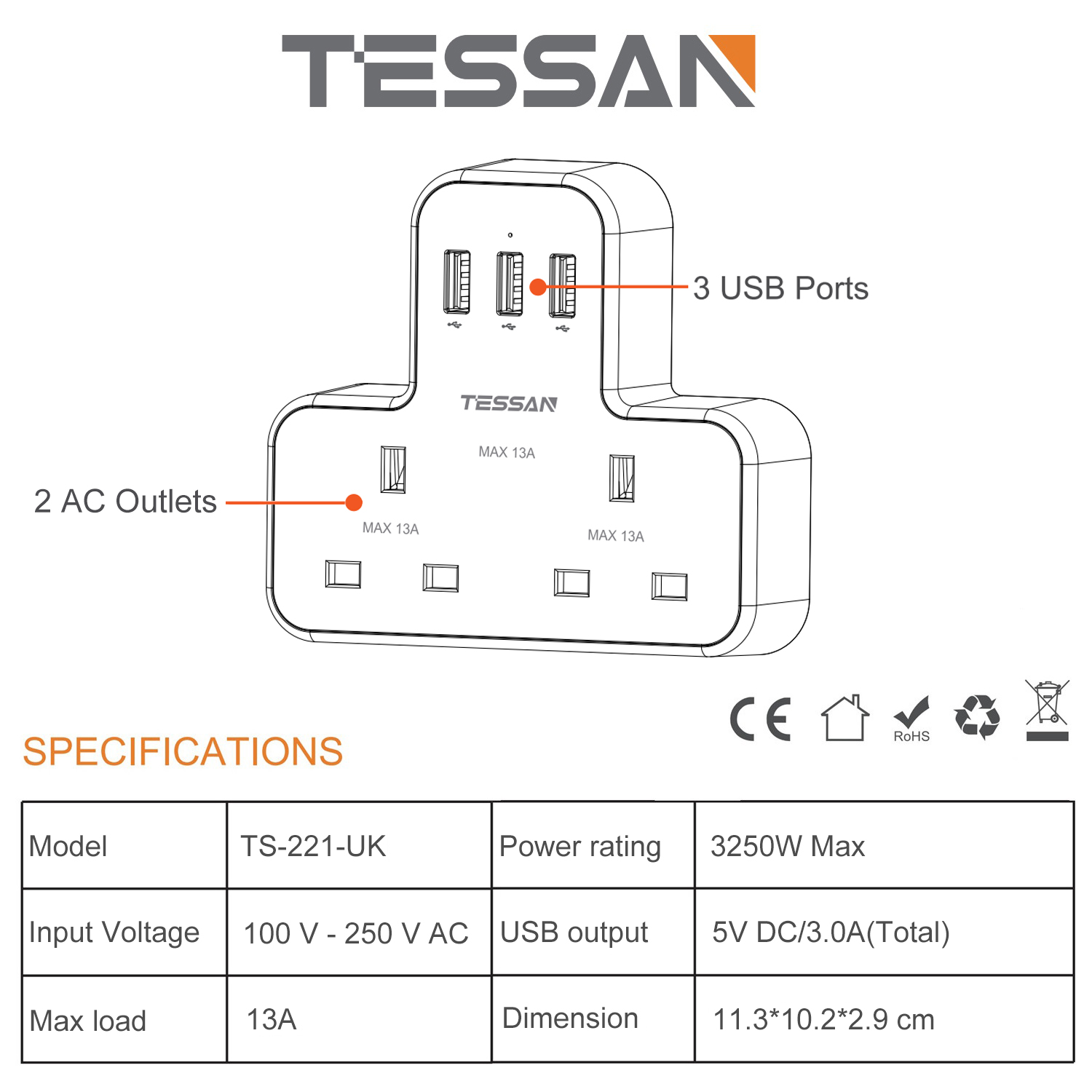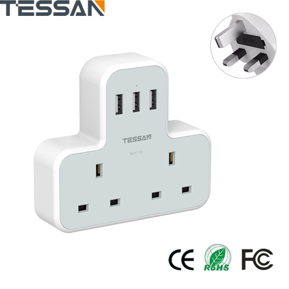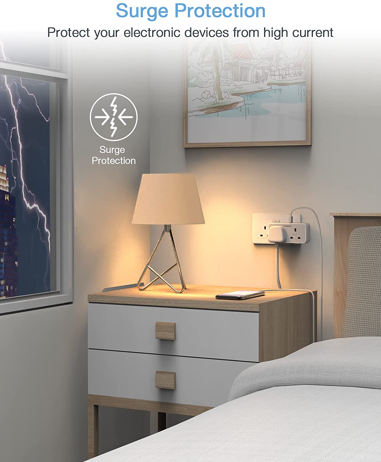 • Multi plug extension - This outlet extender features 2 grounded AC outlets and 3 USB ports, ideal for charging indoors without bulky extension cords. One adaptor for five devices, Max capacity up to 3250W(250V/13A)