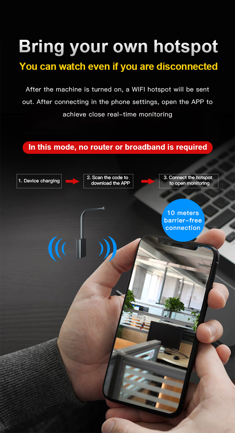 This mini security camera only measures 4.7x0.6 x 1in. Making his small size is easier to do everywhere. Despite its small size, it has vivid, clear pictures on 1080P HD. has two modes: continuous recording and motion detection. The user can pass the corresponding working mode on the button. Continuous recording means that the camera records video continuously. Motion detection is only performed when the camera detects a moving object, which effectively saves the video storage space. In addition, the user can also manually set or the camera performs loop recording. The operation is very simple.