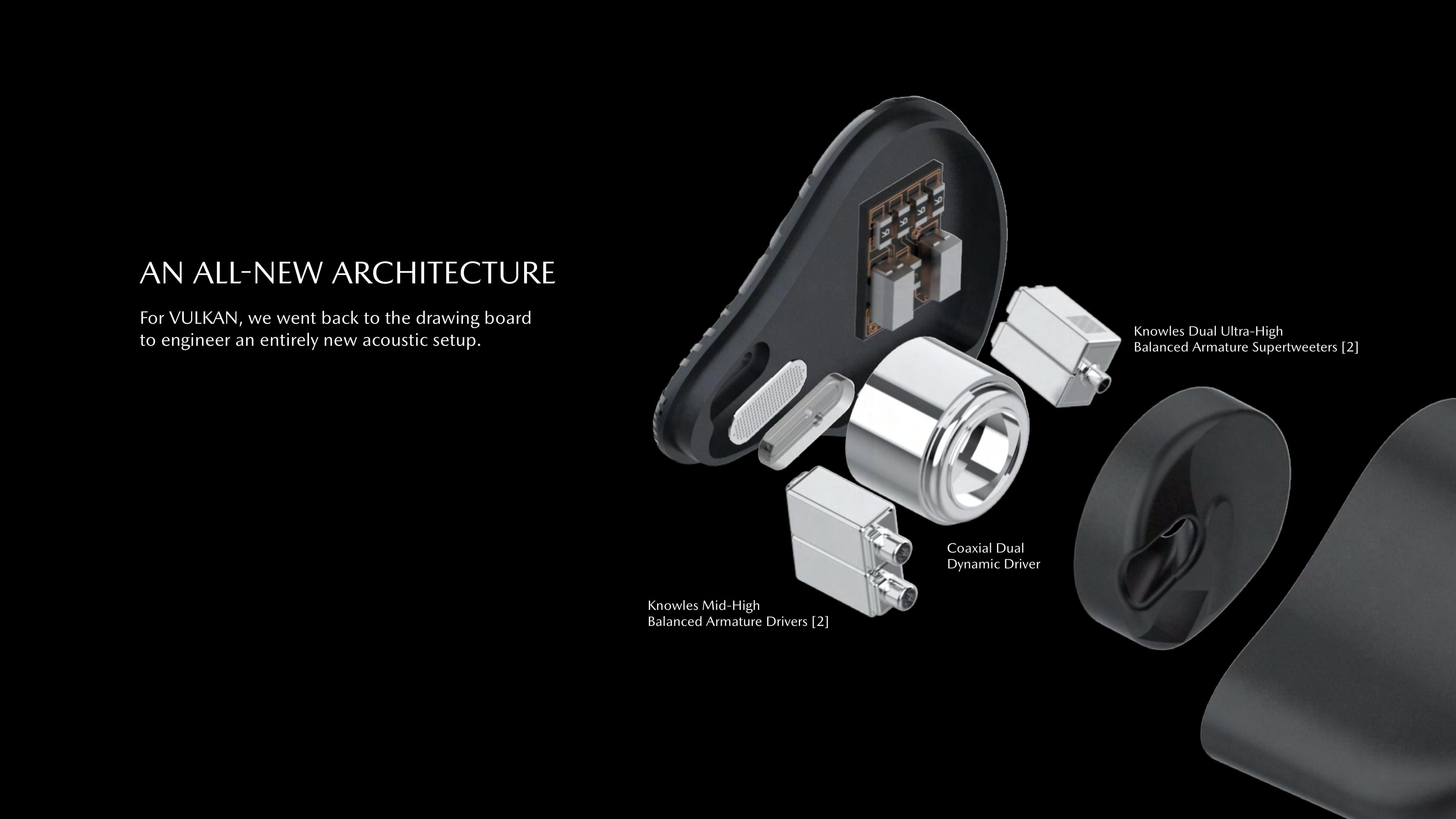 VULKAN embodies power and authority, inside and out. By leveraging the latest virtual and digital tools in our design process, VULKAN is one of the most finely iterated products to be released even before a physical build. Every component has been optimized in software to maximize performance, from the dual coaxially-aligned 8 mm dynamic drivers to the Knowles drivers phase-match with a 3D-printed waveguide inside.