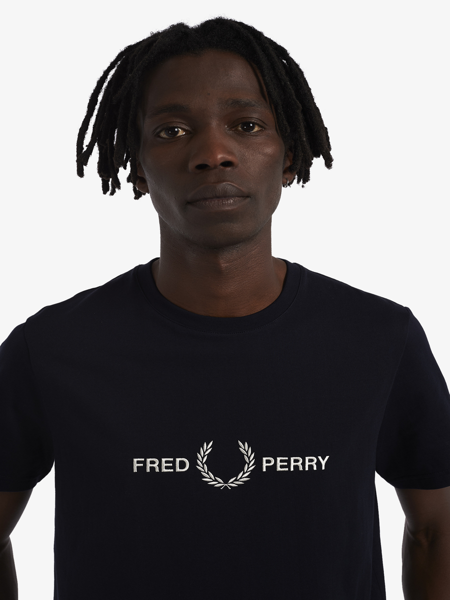 Cotton jersey / Regular fit / Graphic branding embroidery / Printed back branding / Ribbed crew neck .
