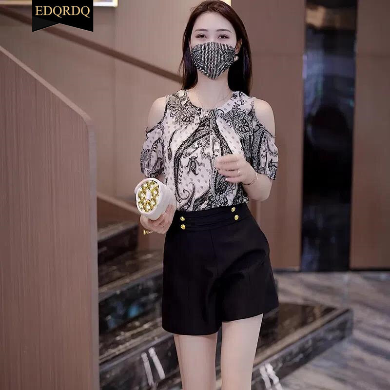 EDQRDQ Women's Cold Shoulder Summer Shirts O Neck Tops Short Sleeve Floral Flowy Chiffon Shirts