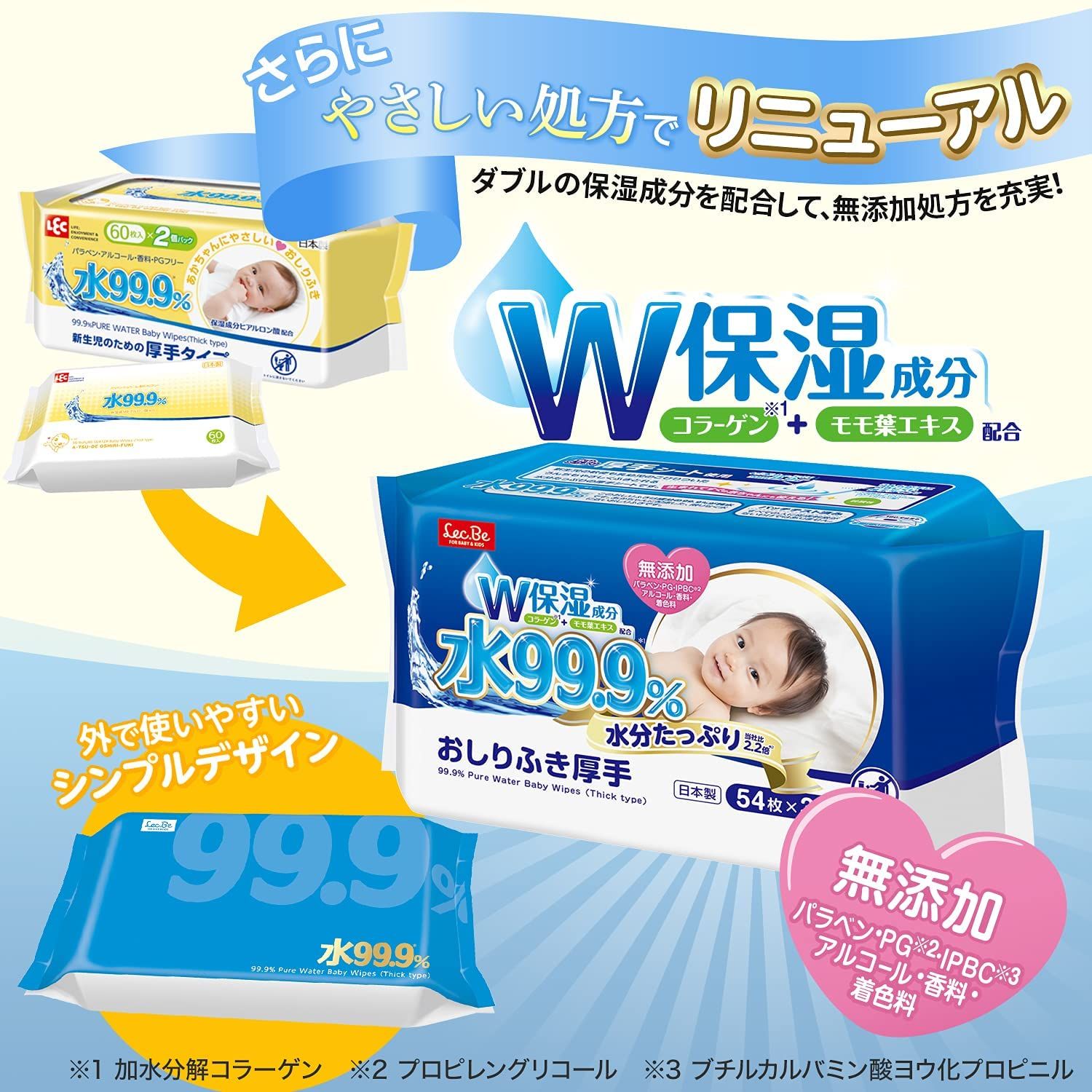 ● It is a thick wet wipes with rich of water content (2.2 times more) compared to other LEC 99.9% Water wipes that can gently wipe off loose stools of newborns and sticky poops of infants.● 99.9% of the ingredients are made of pure water, which is as close to water as possible.● With moisturizing ingredient.Keeps your skin healthy.●.● The open seal has an over stop function that opens 180 degrees and stops, making it easy to remove the sheet.● Manufactured in clean room without human contact from the start of production to packaging.It is made in our own factory in Japan with thorough hygiene control.