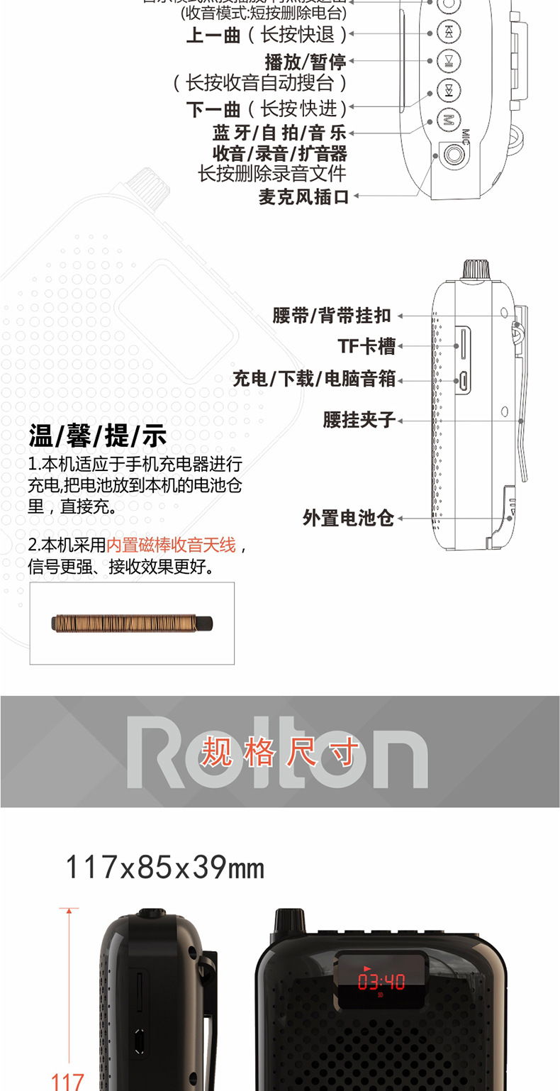 产品标配:头戴式有线麦克风、腰带、充电线(数据线)、电池、说明书、合格证。该型号要实现无线功能,需另外购买无线麦克风。