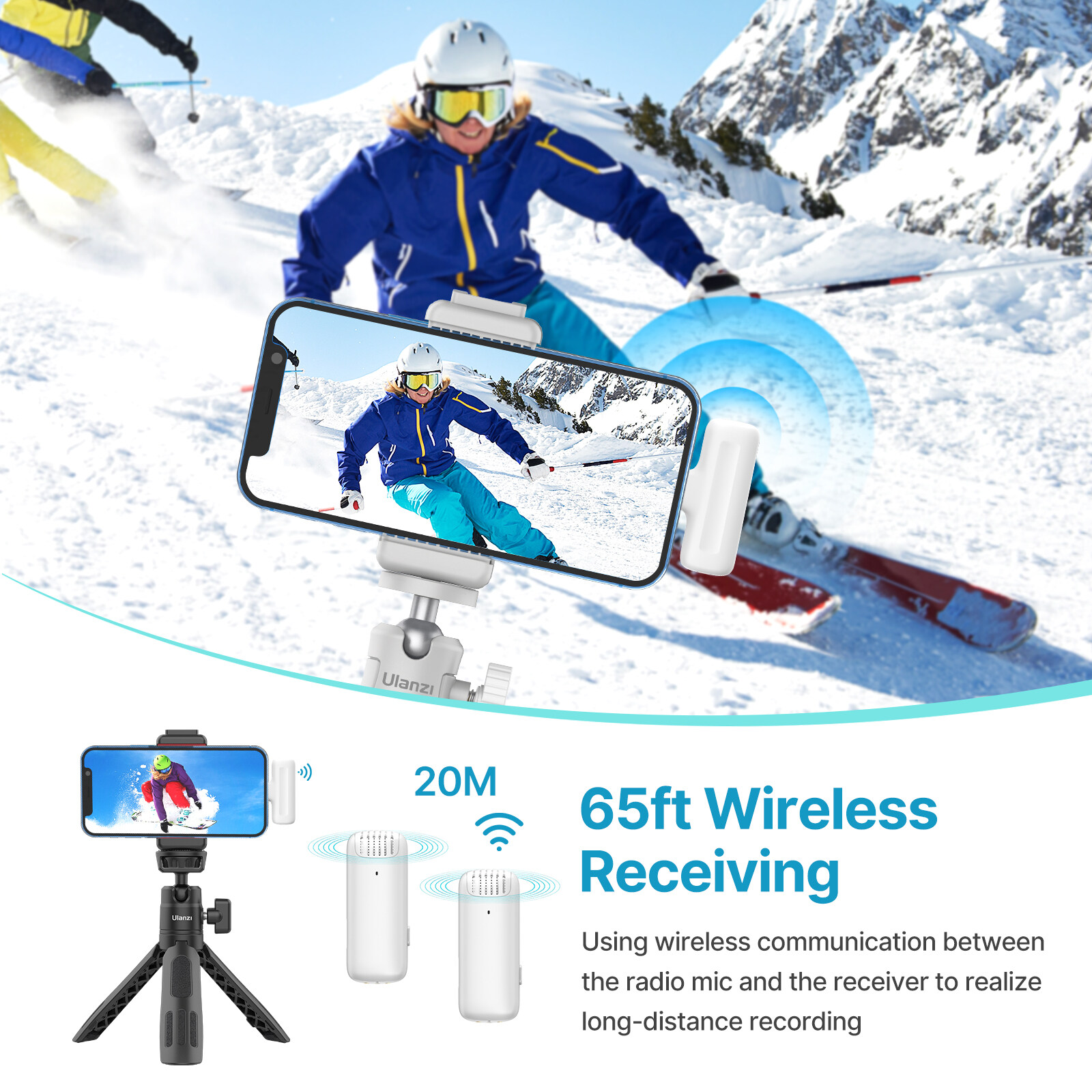 Including 1 receivers & 2 microphone transmitters, supports dual microphone simultaneous recording, plug-and-play, no APP needed, very suitable for phone vlog, live streaming, interview, online chatting, etc.