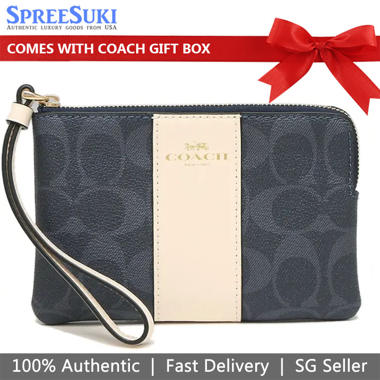 Coach Wristlet In Gift Box Small Wristlet Signature Pvc Leather Corner Zip Denim Blue Off White # 58035