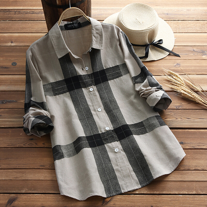 Fancystyle Gracila Women Check Plaid Long Sleeve Casual Loose Tops Shirt Blouse Plus Size