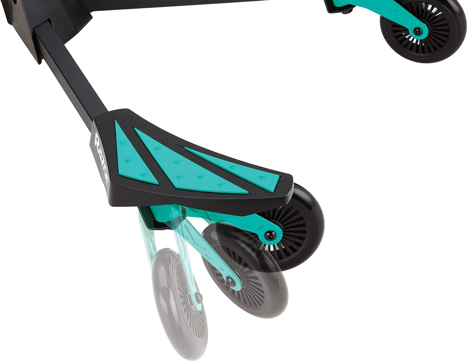 Cleared for Take Off. The all-new Delta Wing steps up to the next level of three-wheel action. Its drop frame, large pneumatic front tire and low-angle rear casters make the self-propelled Delta Wing a powerful yet smooth side-to-side ride, to shred sidewalks and carve up the pavement in style. The Razor Delta wing features a steel frame with high-tech polymer wings, 2 piece "Y" drop handlebar, soft rubber grips, front, hand-operated brake, large 16" (406 mm) pneumatic front wheel, and rear wheels feature low angle trailing casters with large 125 mm wheels for drifting and spinning. Recommended for ages 6 and older and will support a rider up to 143 pounds. The radical new way to ride. Wing it, drift it, spin like crazy. Standing or sitting, these awesome three-wheel machines produce a crazy ride style that's easy to learn. You'll be freestyling in no time. Rip it up with a Razor ride-on. Read and understand the enclosed owner's manual before riding. The buyer and rider of all Razor scooters are responsible for knowing and obeying all local, state and federal regulations regarding the riding and use of scooters.