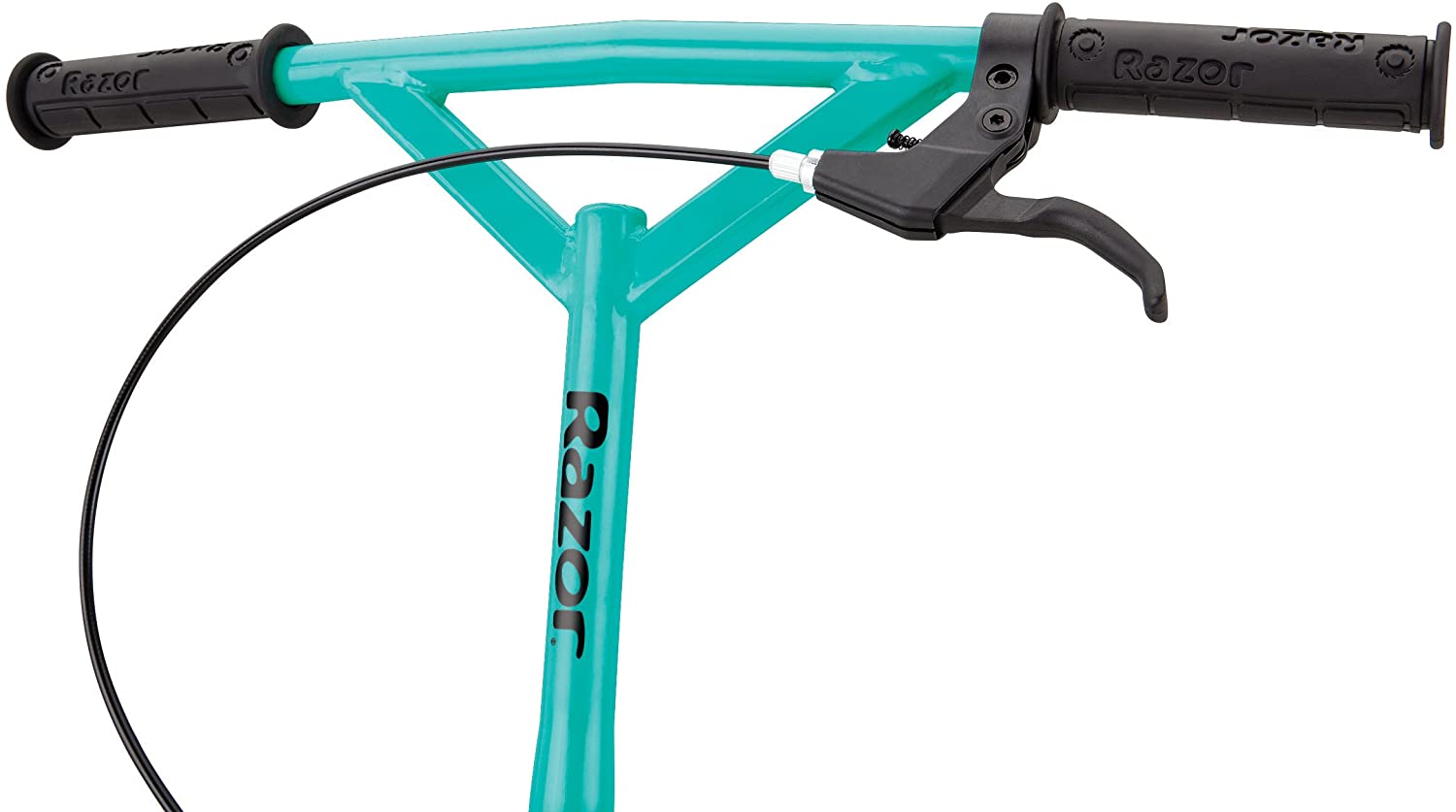 Front hand operated brake and soft rubber grips provide added control and comfort.