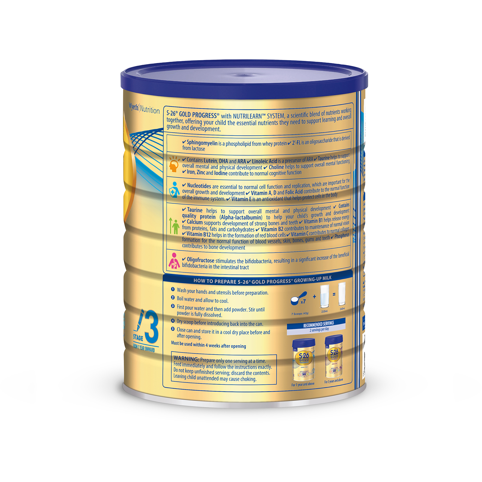 The First 5 years of a child’s life are the most crucial for their development, as the child grows rapidly during this period. Appropriate nutrition is fundamental for their physical and mental development.S-26 Gold Progress® Stage 3 with Nutrilearn SystemTM - contains a scientific blend of essential nutrients to support your child’s overall physical and mental development. It contains: