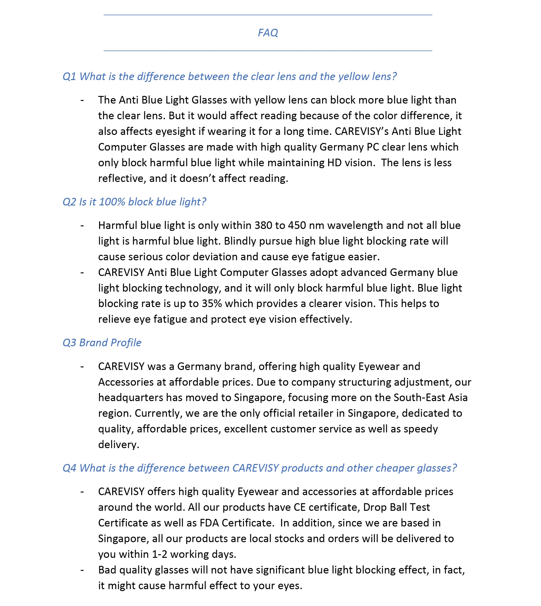 Welcome to CAREVISY, a professional Eyewear brand. We provide high quality Reading Glasses, Computer Glasses, Sunglasses and other Eyewear Accessories at affordable prices based in Singapore. Customer's satisfaction is our top priority. We valued customer's time and we will post out your order by next day. Afterwards, logistic team will pick up your parcel and delivery it to you, expected delivery time by logistic team is about 1-2 working days. Feel free to contact us if you have any queries. Care for your vision and enjoy your shopping now!