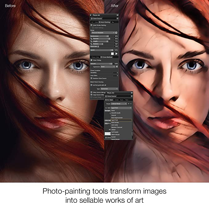 • Transform favorite photos and drawings into breathtaking paintings: Stylize any image using artificial intelligence and easily transform imagery into paintings with powerful Auto-Painting and cloning tools