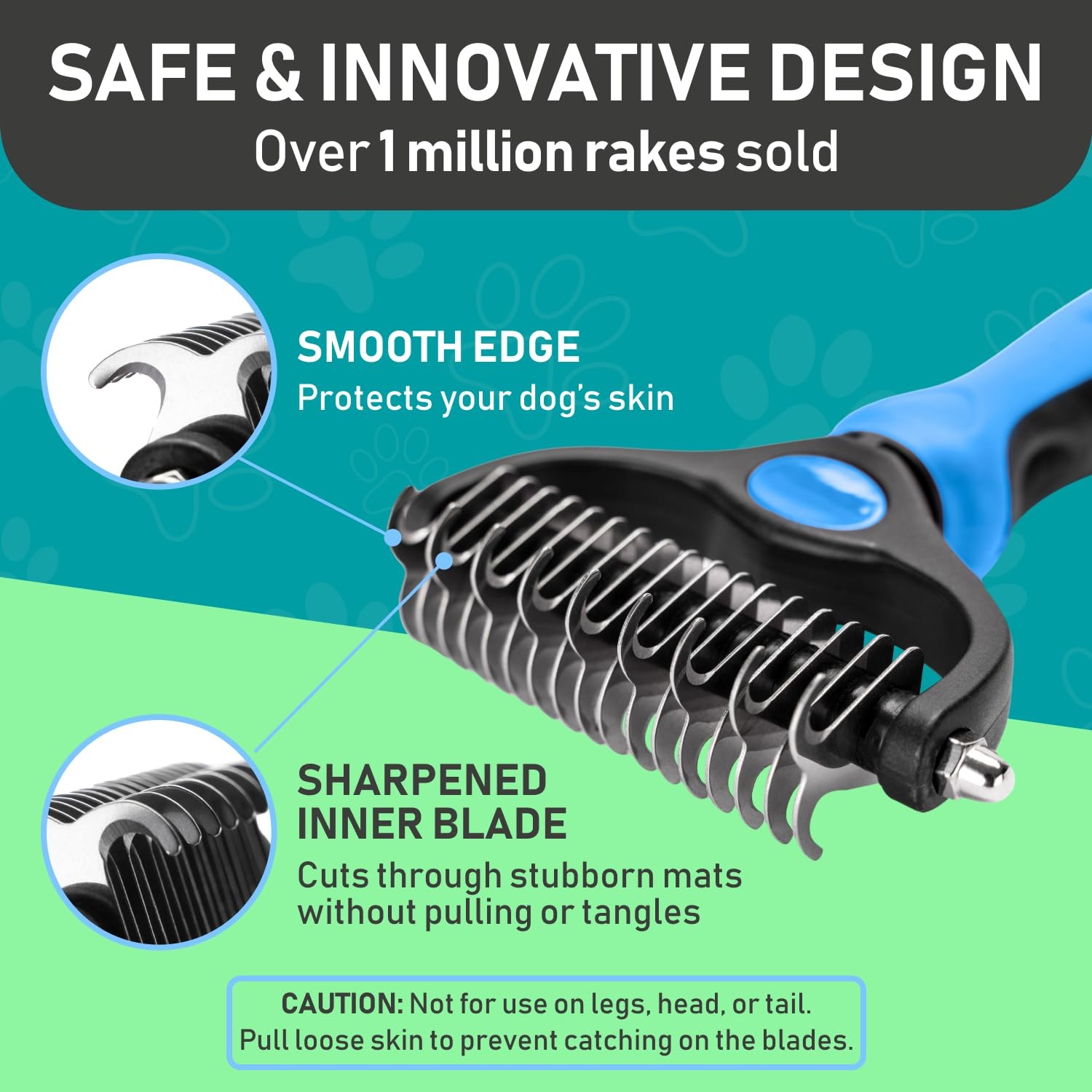 • EFFECTIVE DESHEDDING TOOL: Our dematting and deshedding tool gently removes loose hair and eliminates tangles, knots, dander, and trapped dirt. The perfect cat brush or dog grooming brush solution for pets with thick fur or dense double coats.
